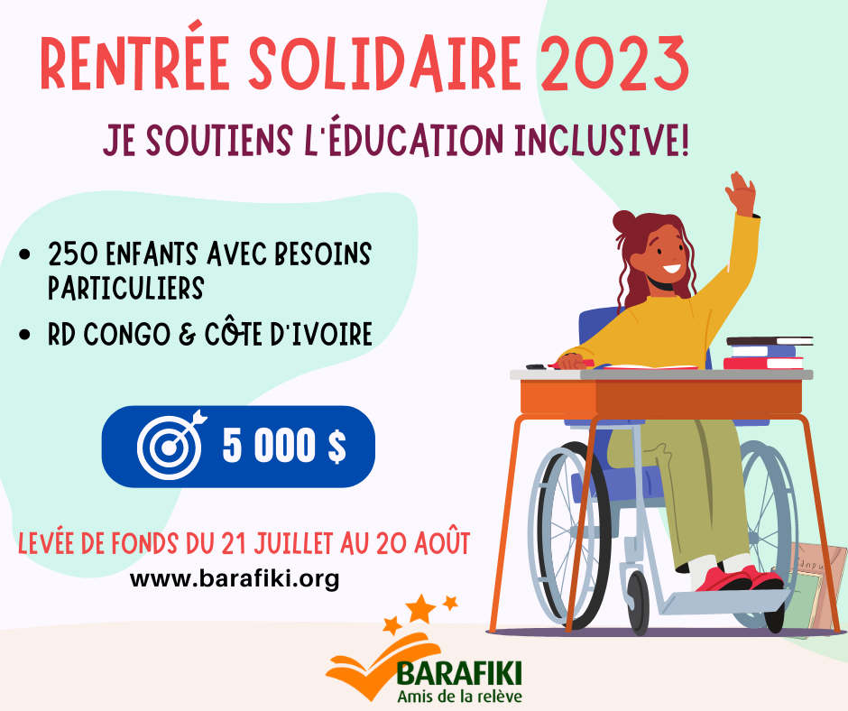 Constante dans ses actions envers l’éducation de la relève africaine, Barafiki lance l’édition 2023 de sa collecte de fonds dans le cadre de son événement annuel ‘Rentrée solidaire’. Cette année, la campagne s’étendra du 21 juillet au 20 août et a pour thème ‘Je soutiens l’éducation inclusive’. Cette initiative cible 250 enfants vivant avec handicap en Côte d’Ivoire et en RD Congo par l’entremise de nos trois mandataires ADICO, Maison de vie et l’ONG Refuge.